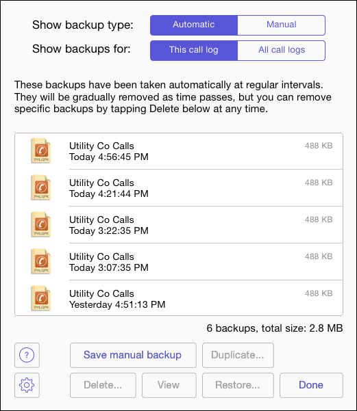 Tap Save Manual Backup to save a backup now for the currently open call log. You can view the manual backups by choosing Manual at the top. Manual backups are not automatically deleted.
